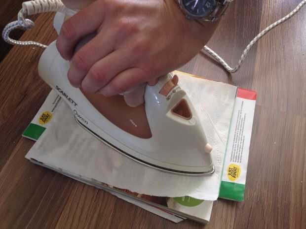 Fijar la plancha al máximo, no utilice vapor. Siga presionando la plancha durante unos 5-6 minutos. Mueva la plancha, especialmente cerca de los bordes para asegurar que el toner se transfiere completamente. Hacia el final, usted debe ser capaz de ver el diseño de PCB a través del papel. Esto significa que el toner se ha derretido y listo retirar el papel.