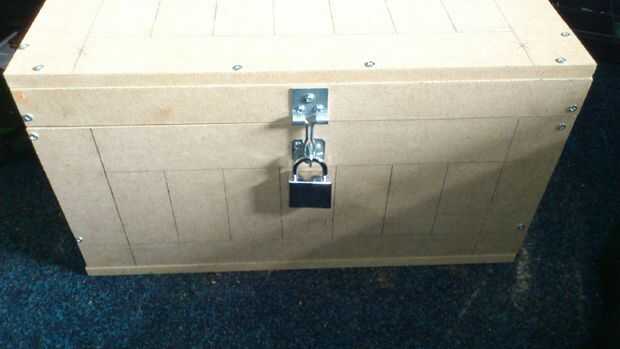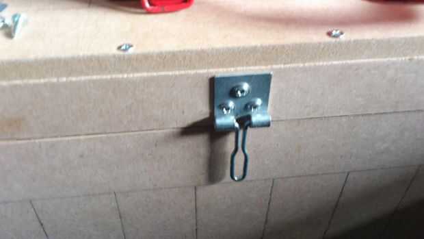 Marcar el centro de la parte delantera de la caja, coloque el receptor cierre sobre él y marque los orificios. Lo mismo para la tapa y coloque el brazo de cierre sobre él marcar los agujeros de taladro.
