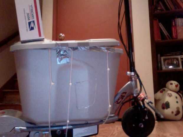 y luego pones tu caja o tina en el scooter y poner las abrazaderas de alambre alrededor de él. Si quisiera que podría poner múltiples conjuntos de lazos para una mejor protección.