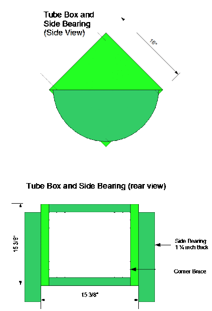 A continuación se muestran diagramas de corte y diagramas de la caja del eje de balancín y tubo con rodamientos de lado. Los dibujos son sólo aproximadamente a escala. Cada uno los lados del eje de balancín están hechos de dos piezas idénticas de 1/2 pulgada de madera pegados juntos, creando dos lados una pulgada de espesor. Además, los cojinetes laterales están hechos de dos semicírculos iguales 5/8 de pulgada de madera contrachapada de pegadas, creación de cojinetes del lado 1 1/4 pulgadas de espesor.