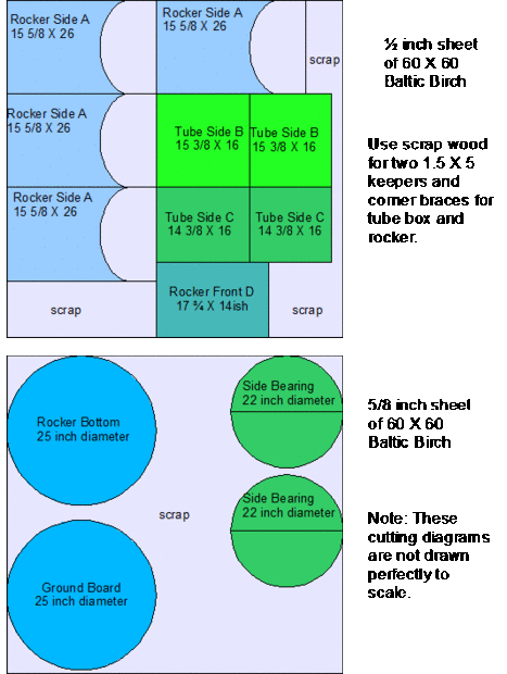 El diagrama de corte (Figura 1) muestra cómo corté las piezas requiere de dos 60 X 60 piezas de madera contrachapada de abedul, 1/una 2 pulgada gruesa y un 5/8.