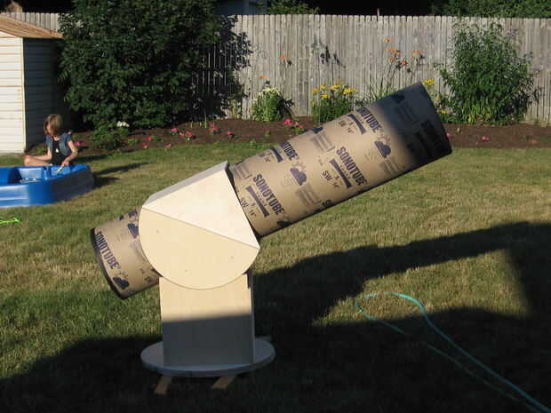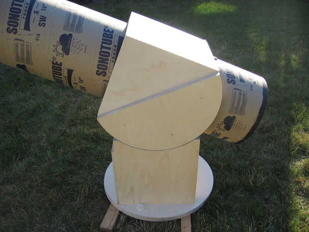 Adelantar unos meses para la próxima vez que tuve el tubo fuera. Casi había terminado la base y poner las cosas juntas por primera vez. Antes de terminar el tubo con una envoltura de chapa de madera, quería asegurarse de que la primaria estaba en la posición correcta. Yo cosas en luz del día y había colimado el alcance. Señaló en los árboles lejanos y no tenía ningún problema en llevar la imagen en foco con todos mis oculares. Yo esperé hasta el anochecer y señaló el alcance en el cielo. Primero probé mi ocular plossl de 32mm. Tal como estaba a punto de entrar en foco, enfoque tocó fondo. Probé todos mis otros oculares y encontré que podía traer la imagen en foco en otros oculares, pero estaba muy cerca de la parte inferior del recorrido del enfocador. # Había instalado el espejo sobre una pulgada demasiado lejos del mecanismo de enfoque. Estaba molesto de haber hecho el error, pero muy contentos de comprobar la posición de estrellas antes de envolver el tubo en chapa. Redrilled los agujeros de la celda del espejo y nos dispusimos a envolver.