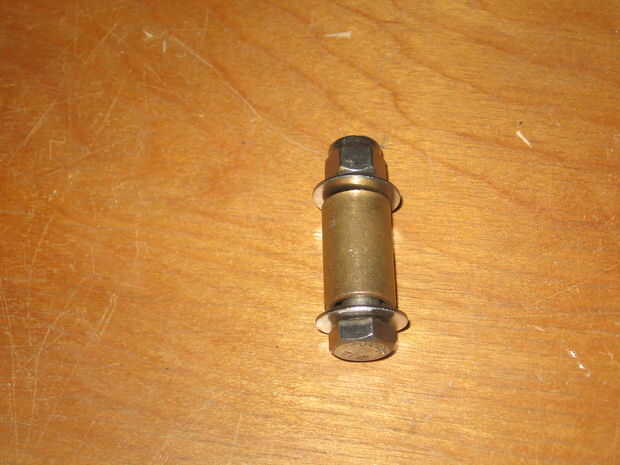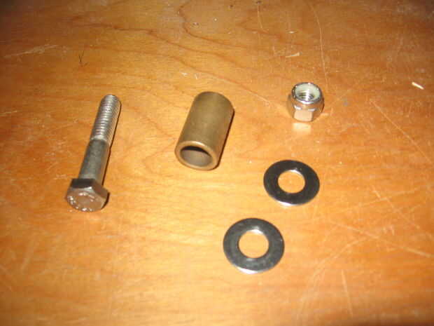 El perno de pivote consiste en un separador de latón de 1 1/8 de pulgada con un diámetro exterior de 11/16 de pulgada, un perno de 3/8 pulgadas 2 pulgadas de largo, una tuerca de tope y dos arandelas grandes. Idealmente, el espaciador sería 1 1/4 pulgadas de largo y tienen un diámetro más pequeño, pero no consigo este una derecho primera vez. Empecé con un espaciador que con un diámetro exterior de 1/2 pulgada. Perforó los agujeros en el centro de la tierra Junta y eje de balancín parte inferior con una broca de 9/16, pensando en que necesitaba los 1/16 extra que podría mover el separador. Resulta que el el 1/16 extra permite demasiado movimiento de lado a lado entre la tierra Junta y eje de balancín. No he podido encontrar un espaciador para encajar mi agujero de 9/16, así que compré el espaciador de 11/16 (1 1/8 de largo porque eso es lo que la tienda) y un poco del mismo tamaño. El agujero tuvo que ser agrandado levemente moviendo la broca en el agujero, pero al final, el ajuste parece correcto.