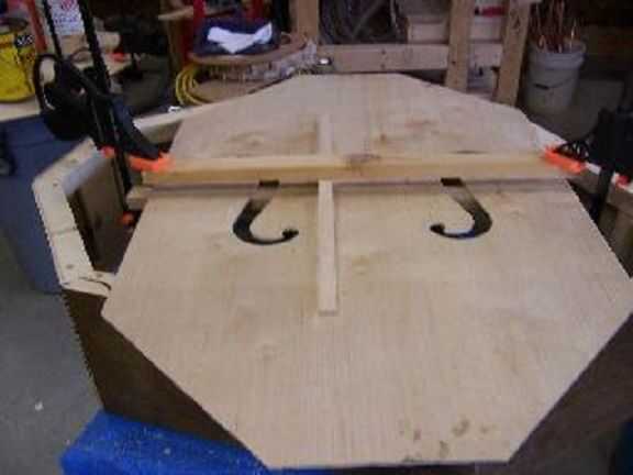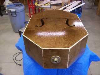 se trata de un función completa vertical bajo violín hecho principalmente de materiales comunes del centro de mejoras para el hogar. Que recorte de una "C" para su uso con un arco tiene todas las características de un bajo comercial con barra baja, post sonido y cuello/diapasón de tamaño completo. El bajo pesa alrededor de 35 libras. El bajo tiene un diapasón plano y no está diseñado para su uso con un arco. Es su única limitación. Tiene el tono y el volumen igual a muchos bajos comerciales de vertical. A precios de hoy el bajo se puede construir para alrededor de $100. Se puede construir en un fin de semana sin contar el tiempo para la coloración y el acabado. Las herramientas necesarias son una Hanon, Sierra, router, clavadora y equipo de lijado. La unidad central se hace de 2 x 2, 1/4" madera contrachapada estándar y estándar esquina madera ajuste. Las clavijas de afinación son clavijas estándar de un bajo eléctrico. Las cuerdas son alrededor de $25 con frecuencia encontrado en ebay y son a estrenar. El perno de cola es una pata de silla montada en un reborde de la pipa. El puente y el cordal son caseros. Y por último pero no menos importante, tiene su propio transporte manija para fácil transporte. Se trata de un bajo que puede acutally tirarla en el camión e ir."