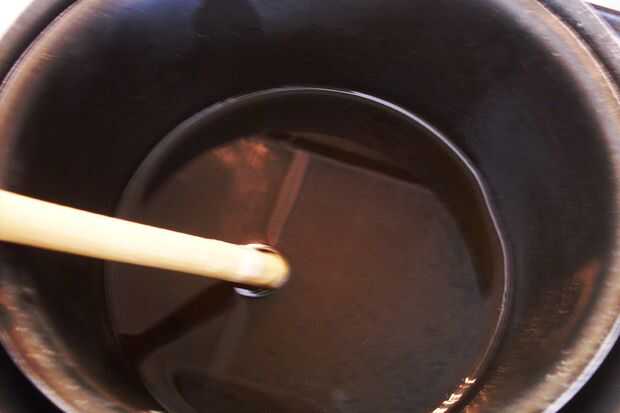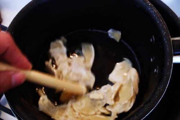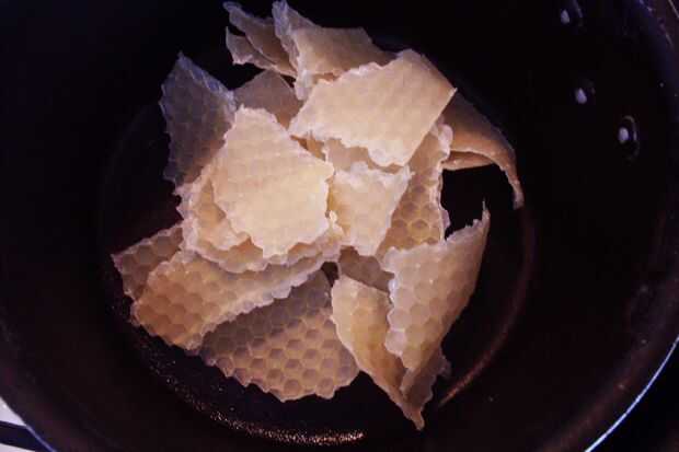 Cera de abejas se romperá en pedazos más pequeños. Derretir a fuego medio.