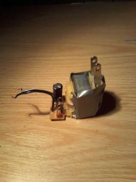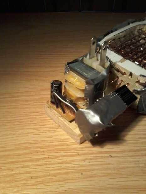 Rodean la parte frontal del transformador con cinta adhesiva. Coloque la batería y el transformador en mango como se muestra. El cable negro de salida al positivo de la batería y el cable blanco al cable negativo de la cinta. Envuelva la cinta alrededor del transformador y la batería, conexión al mango.