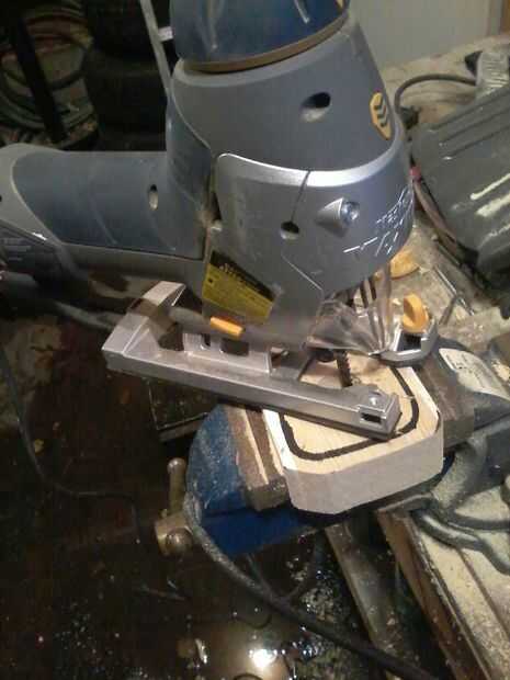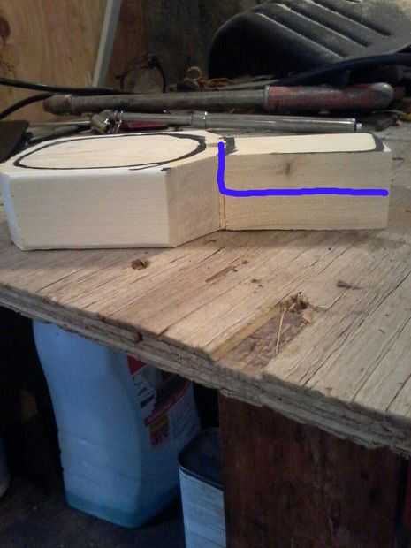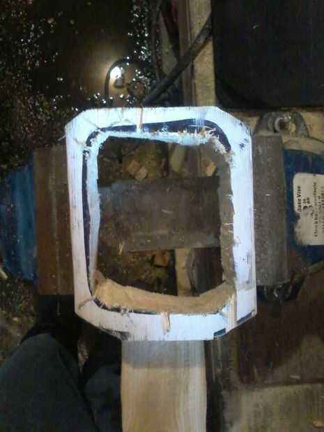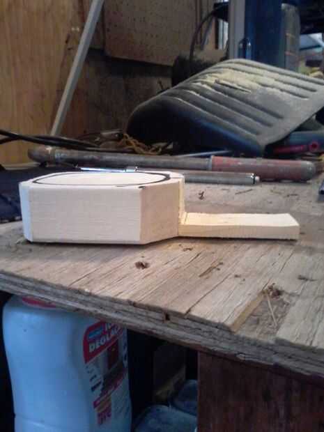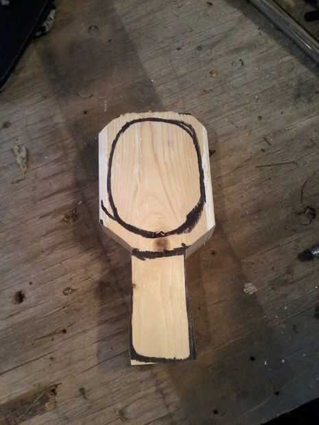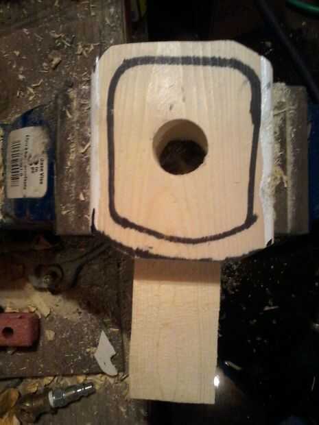 Ahora, dibuja un círculo en su interior alrededor de una pulgada lejos del borde exterior. Utilizando el taladro y una madera de gran diámetro, perfore un agujero en el centro. Probablemente desee poner primero la pieza en una abrazadera.