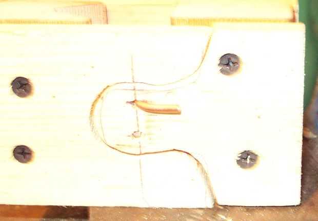 Cortar un segundo lado de una pieza delgada de madera. El más fino, mejor. Va ser flexionada cuando se inserta la batería. Corte un alivio o dejar de lado dos de los tornillos para que la madera se dobla un poco cuando los contactos se deslicen en. La forma de pieza de rompecabezas no es necesaria, pero hace más fácil el corte en una sierra de cinta. Permiten puntas de material de ambos lados que pueden doblar de la manera como se inserta el paquete.
