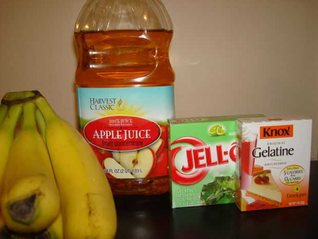 He realizado algunos gelatina de plátano que se hizo con jugo de manzana, Knox sin sabor del plátano y gelatina. He mezclado el jugo junto con el plátano y había seguido la receta. Es muy bueno probado. El color fue por desgracia, por lo que no usarlo. Pensé que sería increíble para hacer un gelatina llena de plátano plátano! Se probó como un plátano sólo tenía una textura diferente.