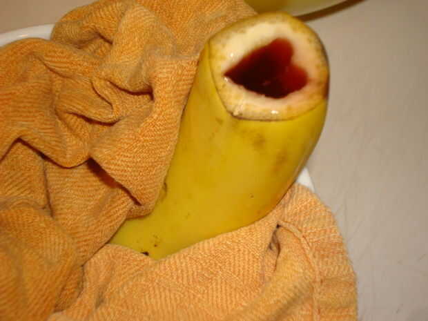 Chill (cuando se firme el final corto, frote ligeramente con agua y coloque nuevamente en el plátano emparejar a la sección de plátano y enfriar nuevamente hasta que muy firme.