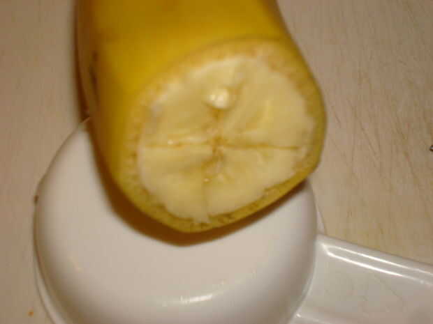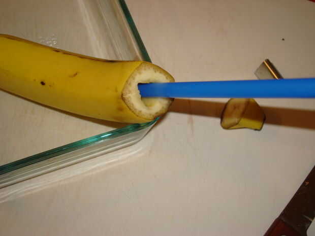 Retire aproximadamente 1/4 a 1/2 de los interiores de plátanos como se muestra usando el cuchillo y la paja.