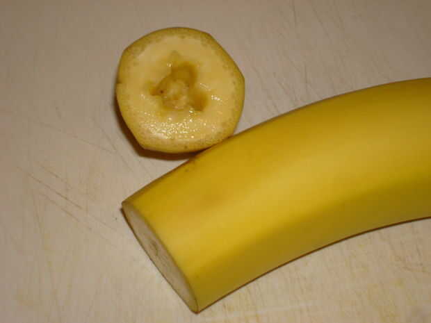Usando el cuchillo con cuidado recorta alrededor del interior del plátano como se muestra.