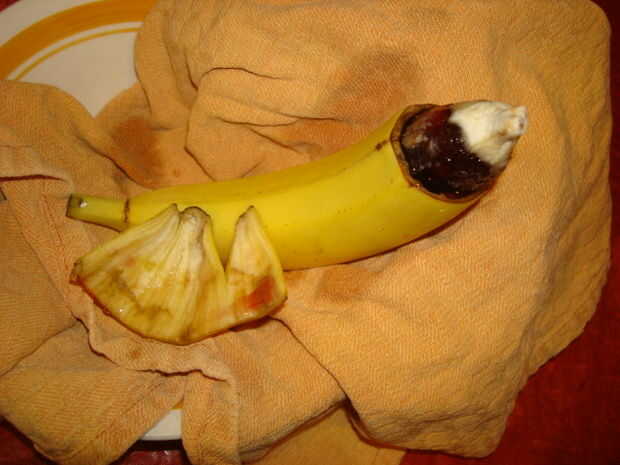 Cuando el extremo del plátano es firme, ligeramente mojado la gelatina y coloque sobre el plátano como se muestra o...