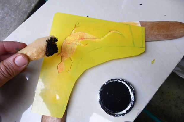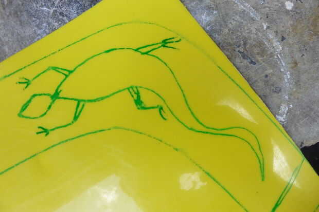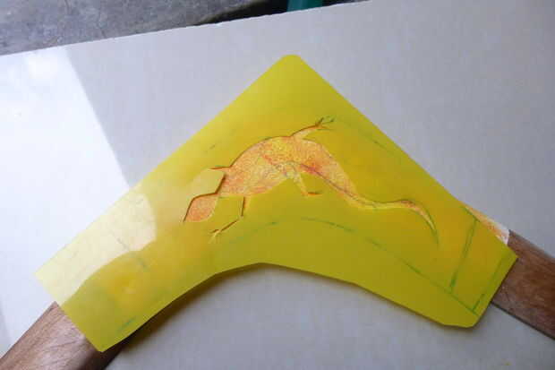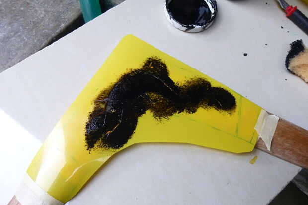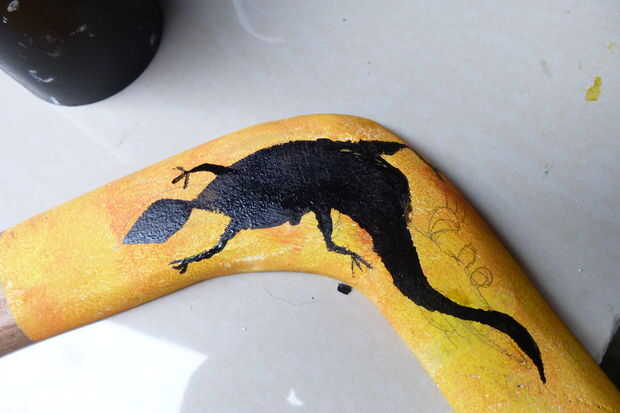 Entonces en una hoja de acetato, acrílico dibuja las plantillas con la forma que desee. En mi caso dibujó la forma de animales australianos, como: canguros, lagartos, Plattypus, etc.. Luego cortar la forma básica y comenzar a Stamp en el Boomerang con pintura negra. Sólo un Consejo, en las tradicionales pinturas australianas, es tan generalmente el blanco señala entre una cinta negra, esos puntos blancos eran pintados con la punta posterior del cepillo. Los pequeños detalles fueron diseñados con negro Sharpie.Use las pinturas que quieras y diviértete con tu imaginación.