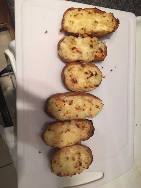 papas dos veces asadas son una receta de familia! Espero que probarlos y disfrutarlos!cebollino para decorar6 papas medianas1/2 taza de mantequilla1/2 taza de queso cheddar1/2 taza de lecheSal1. precalentar el horno a 425 grados F2. Limpie y restrieg
