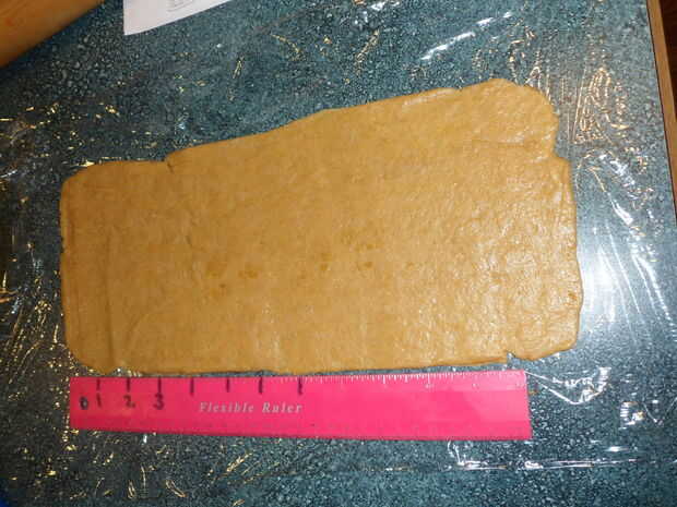Hacer la masa en un rectángulo cortando los bordes con una regla. Formar un rectángulo que mide 6 pulgadas por 13 pulgadas.