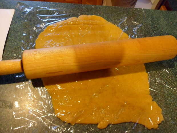 Divida la masa por la mitad. Tome una mitad de la masa y colóquela sobre la envoltura de plástico. Poner otro trozo de plástico en la parte superior y estirar la masa con un rodillo hasta que quede bastante delgada, aproximadamente 1/8 de pulgada.