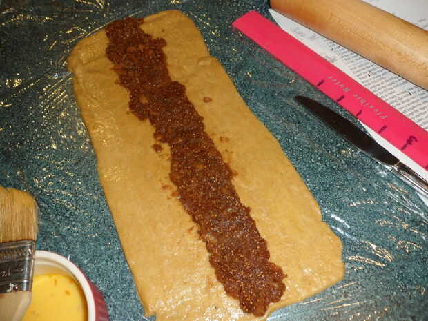 Si usted quiere, suavemente se puede aplanar con el rodillo, poner algunas envolturas de plástico entre el relleno pegajoso y su perno de balanceo.