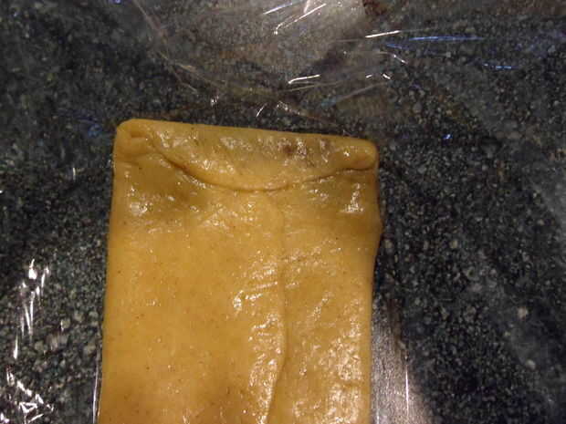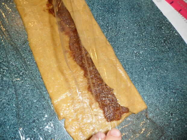 Esta parte es un poco complicada. Cinta de las Naciones Unidas la envoltura plástica en el mostrador. Levantar un lado de la envoltura de plástico y doble, para que la masa es doblada en el centro. Su tipo de difícil de describir, ver las fotos. Luego, plegar el otro lado, por lo que está encerrado el relleno. Frotis de la costura juntos y sellar los extremos. Ahora ha formado un tubo de newton figura poco agradable!