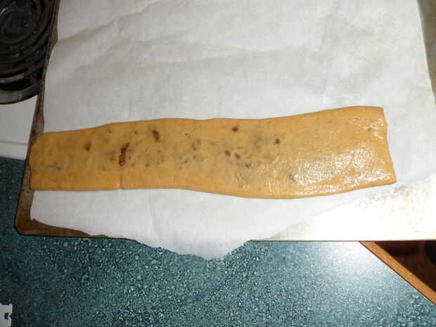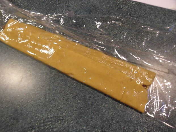 Coloque papel pergamino en una hoja de galleta. Transferir el tubo sobre la bandeja para hornear galletas. Utilizar la envoltura de plástico y deslice el tubo sobre mi antebrazo, luego voltea sobre la charola.