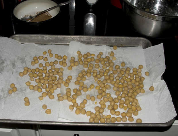 Ponga algunas toallas de papel en una bandeja las hojas y verter los garbanzos. Con más toallas de papel en la parte superior, comienzan los garbanzos alrededor del balanceo. Esto al mismo tiempo secarlas un poco y ayudar a eliminar las pieles.