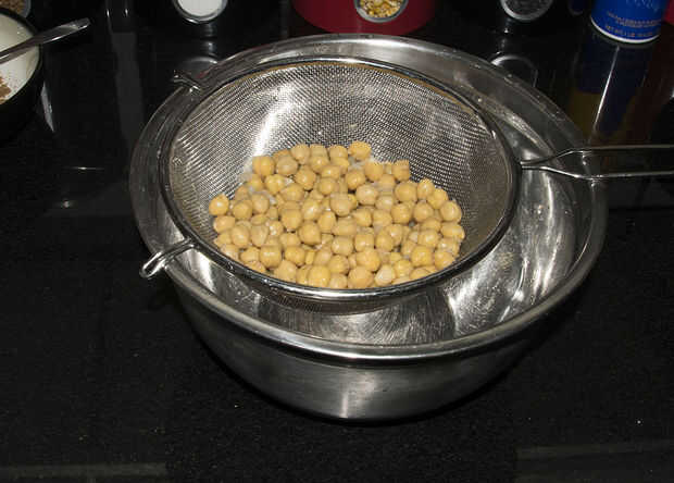 Abrir una lata de 16 oz de garbanzos y enjuague bien con agua fría, agitar con la mano. Como mezclarlo para arriba, la piel comenzará a salir.