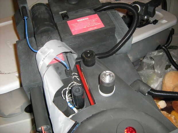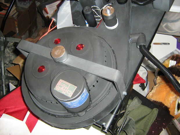 me hubiera encantado diseñar una configuración donde las luces parpadear en secuencia hacia la derecha como el cine lo hizo en un fundido en-se descolora hacia fuera el patrón. Pero realmente no tenía el tiempo para configurar y construir uno, así que engañado y encontró un sistema de luz intermitente de la tienda de hobby por $5. Había diez luces en el set y parpadeó dos a la vez en orden más o menos aleatorio. I taladrar cuatro orificios en el plástico en la parte superior el ciclotrón y usa los reflectores de luces flashes baratos cuatro. El rojo vino de botellas de plástico.