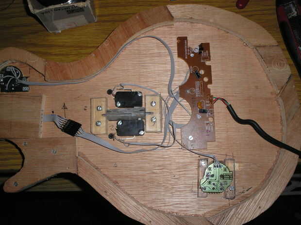Montei um dos direcionais lado de cima da guitarra e o outro grupos como acionador da Barra de trémolo. Simplesmente, fixei do lado de tras usando um pedaco de acrilico como suporte e parafusei na madeira. Para la whammy bar, fiz um rasgo na madeira com o caminho que una barra ira percorer e fiz um furo na capa, tan Umm pedaco de arame rigido como alavanca.