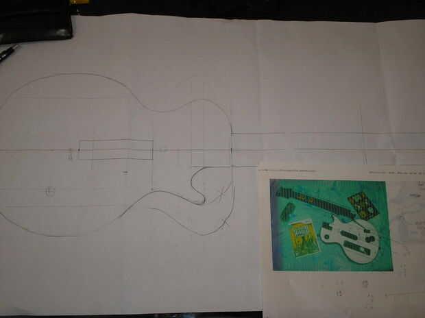 Primero de todo, busqué en Google una imagen del mando de WII Guitar Hero que he podido para extraer las medidas aproximadas. He encontrado una imagen con el controlador y una caja de DVD cerca, así que escala la imagen basándose en el tamaño de la caja de DVD y crear un modelo de papel.