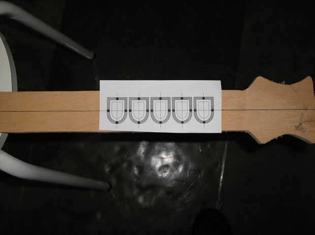 Dibujaba los botones en un papel y pegada en el cuerpo de la guitarra, transfiriendo las líneas con papel carbón. Me perforó los agujeros con una taladro de la máquina y acabó con una pequeña herramienta rotatoria.