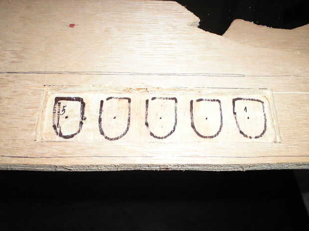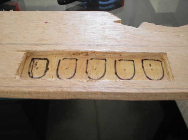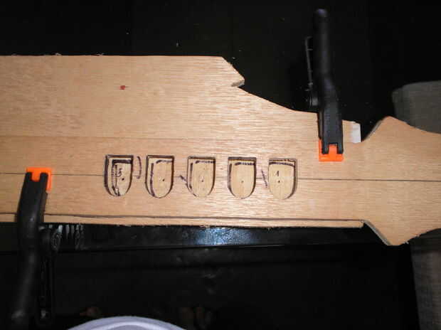 La parte posterior del cuello se hizo unir el frente y la espalda y dibujando una línea. Después, hice el lugar para los contactos del botón cortar tres capas de madera contrachapada. Planchas de madera deben ser vivida en la base de la parte posterior del cuello para sujetar el cuerpo de la guitarra. Su saque es necesario una fina capa de madera contrachapada para hacer un canal para trastes cables.