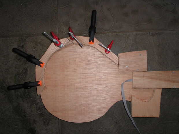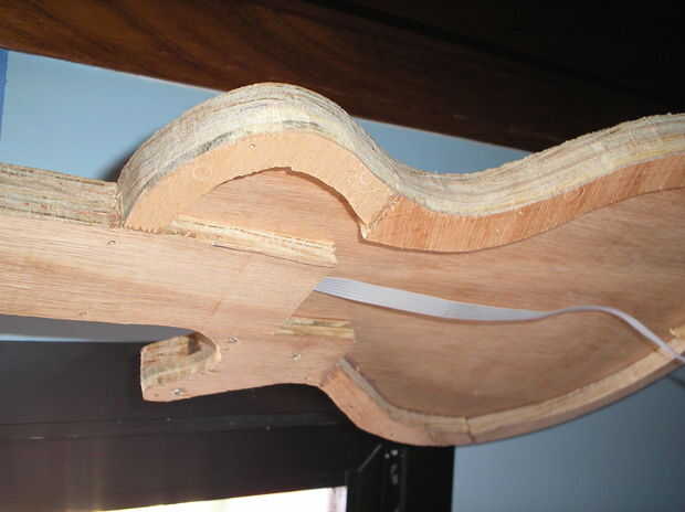 He creado una especie de caja para dar cabida a las partes electrónicas, aumentando el espesor del cuerpo pegar algunos trozos de madera y lo aserrado a. Tengo no fotos de la tapa, pero utilicé una lámina de madera fina y había aserrado según las líneas del cuerpo. Había atornillado la tapa en el cuerpo.
