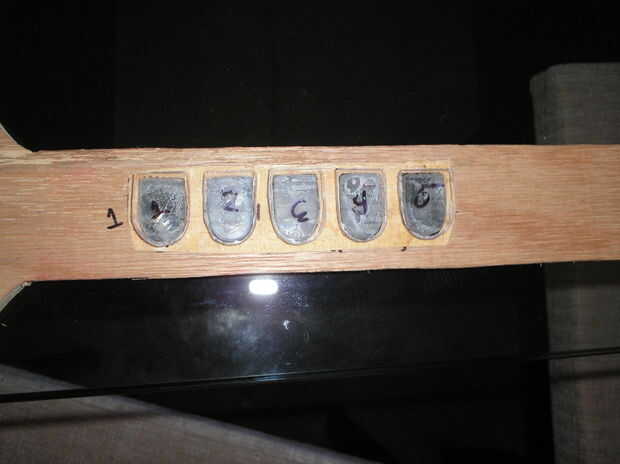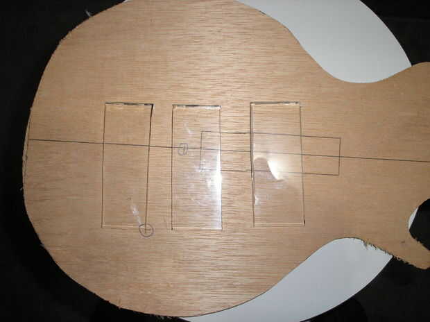 Solía los agujeros en el cuerpo de la guitarra dibujó las líneas del botón, cortar con un disco abrasivo y acabado con piedra de lijar.