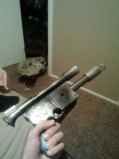 Manchado el mango oscuro marrón grabado fuera y el cuerpo de la pistola con pintura en aerosol negro brillante pintado. Entonces debe tener una plata ligeramente rociado en las esquinas y los bordes para dar la pistola un aspecto envejecido, usado como él.