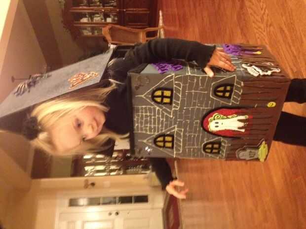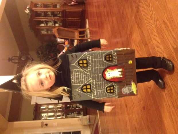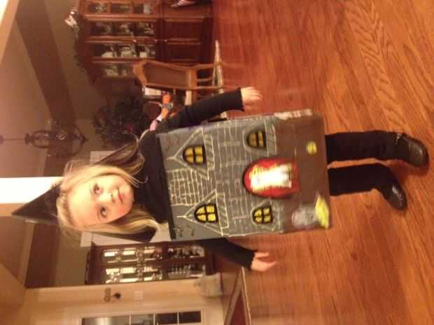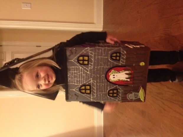 este traje fue creado de una simple caja marrón recogida en una tienda de comestibles. Utilizamos cartulina negro, fieltro material, brillaba Paneles adhesivos, limpiadores de pipa, varias pegatinas y apliques y pintura brilla en la oscuridad. Usamos pegamento para ensamblar cosas en la caja, velcro correas ajustables y suavizar los bordes ásperos de la caja de cartón. Entonces, acabó aplicando pintura negra y acabado del material para techos. El techo fue atado a una aleta de la caja por lo que se cernía sobre la cabeza de Sarah, pero no estaba atado a la cabeza como un sombrero, ya que ella no tolera sombreros.