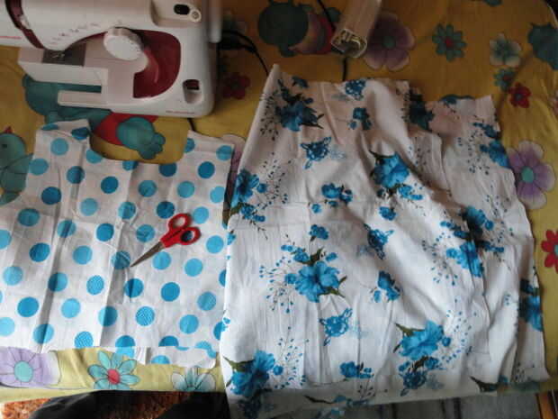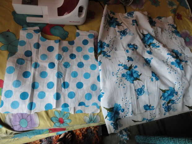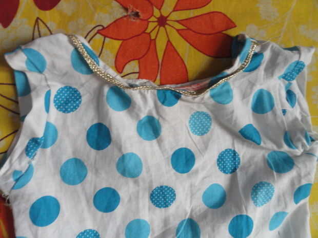 Doble el paño de polkar diseño del punto por la mitad y nuevamente doblar por la mitad (del mismo lado). Ahora donde hay 4 placas de tela cortan cuello de aproximadamente 3 pulgadas de radio y ahora cortan de otro corte lateral circunferencia de 7cm para los brazos. Ahora después de quitar dos placas de tela para el frente brazo 1/2 pulgadas de profundidad por lo que consigue encajar el brazo. Ahora desde el brazo hasta la cintura hacer un corte inclinado.