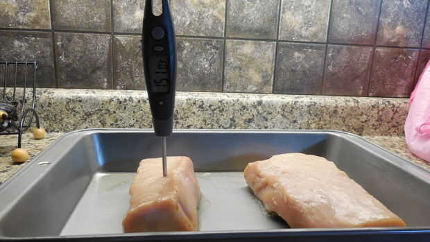 Precalentar el horno a 200, poner el tocino en una hoja para hornear o bandeja (yo uso un molde de lasaña). Cocinar hasta que el tocino ha alcanzado a una temperatura interna de 145ºF-150ºF en la más gruesa. 1-1 1/2 horas... depende de lo nerviosa que soy y por lo tanto abrirlo demasiado para comprobar la temperatura.