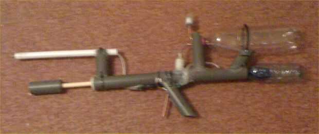 cómo construir un juguete super-soaker-como de PVC.Este mortero de agua está hecha de PVC con una variación en la técnica de "taladro torno" del libro "Cubículo excéntrico." El producto final se lanza sobre un cuarto de galón de agua p