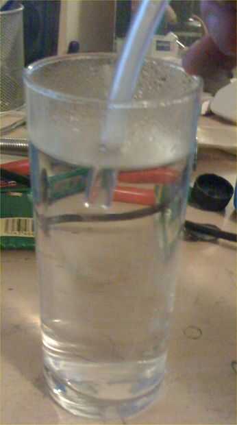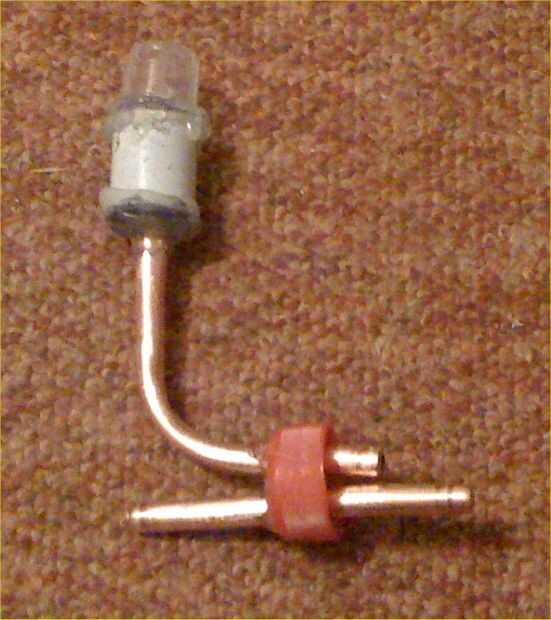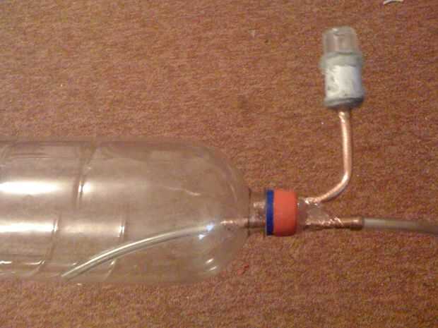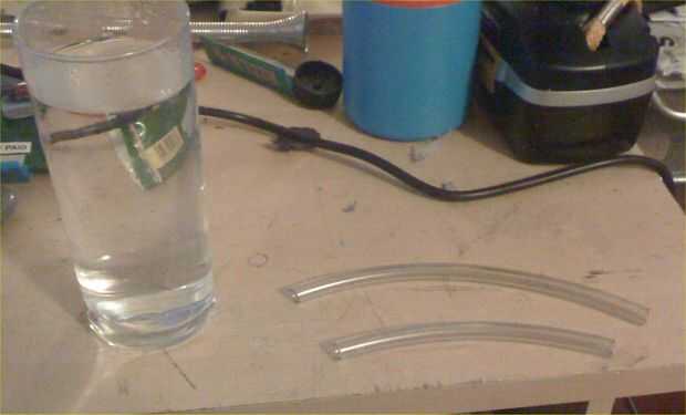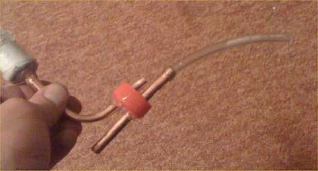 Ahora corte 2 pequeños tramos de tubo de 5mm, uno irá dentro de la botella de la pipa de cobre por lo que debe ser lo suficientemente larga para tocar el fondo de la botella. El otro irá a la entrada de la bomba así que cerca de 10cm de largo. Mejor hace demasiado tiempo que demasiado corto.
