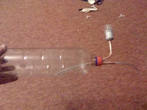 Componen de una válvula como hiciste con la bomba antes de, pegué la tapa a la parte superior de la mina para detener la suciedad en él. La válvula debe dejar aire en pero no deje que el agua hacia fuera. tienes que tener una entrada de aire se derrumbará la botella que hará mucho ruido y no puede escucharse cuando el arrastramiento sobre listo para saltar sobre alguien y remójelos. :-)