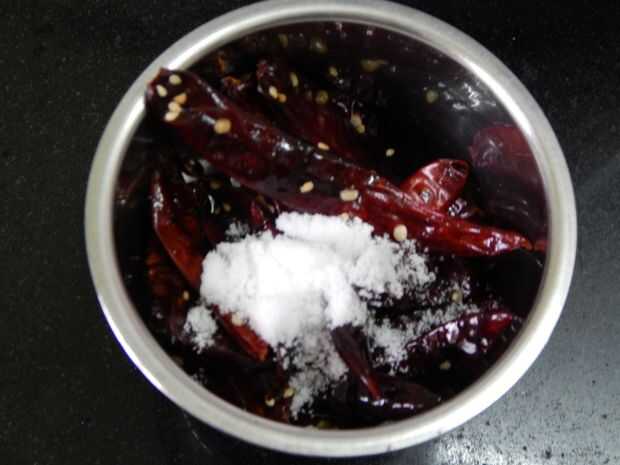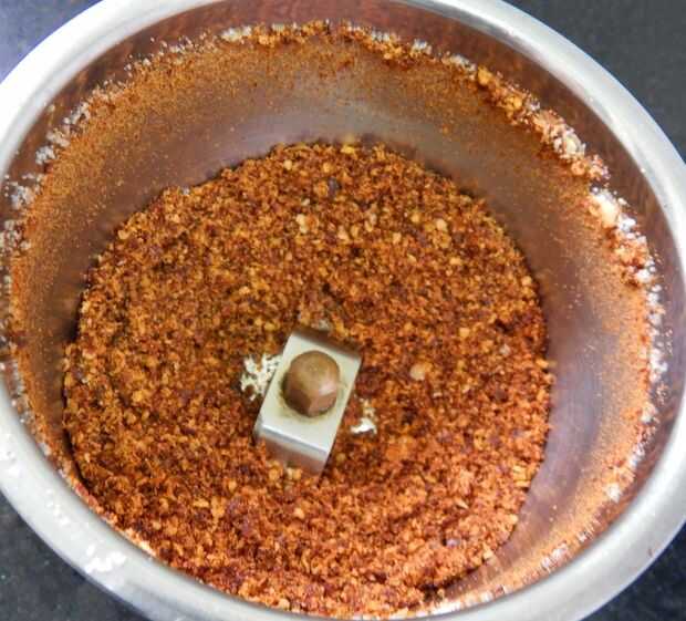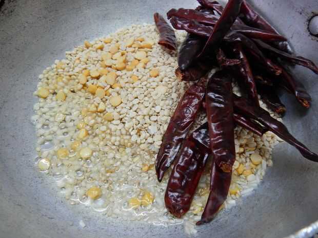 Siempre primero moler chiles rojo frist. A continuación añadir la dal para conseguir una perfecta textura gruesa.