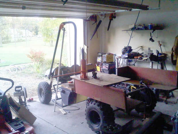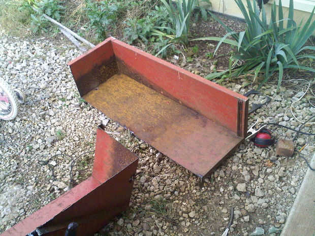 Para la cama me corte un carro del tractor del jardín por la mitad y parches en el medio con placa de acero.