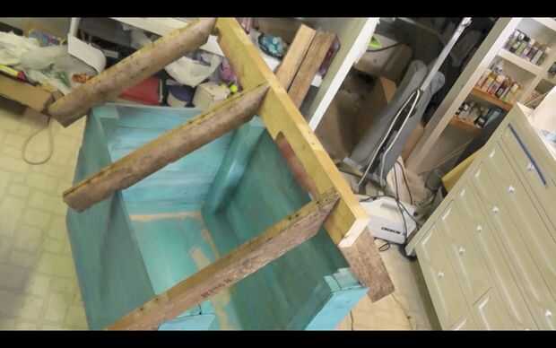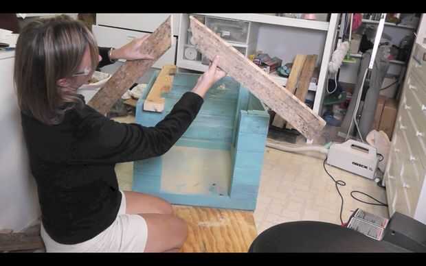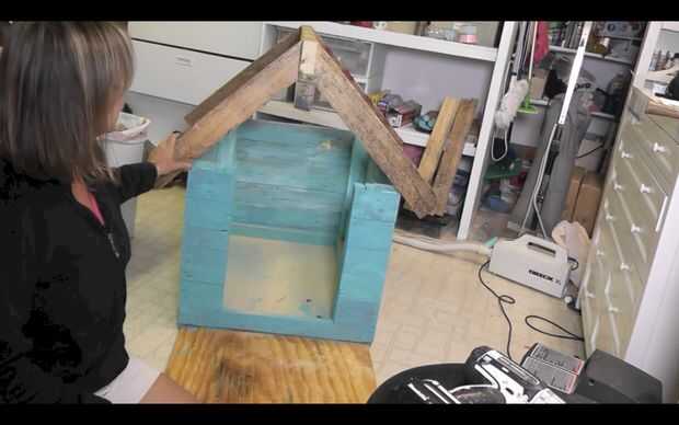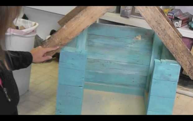 Tiempo para construir el techo. Usé más madera de los palets y había creado un techo de celosía. Cortar en un ángulo de 45 grados y tenía una viga de centro. Clavan juntos. En las fotos puedes ver que el enmarcar de la azotea estaba sentado sólo sobre la base de la caseta del perro. Yo muescas piezas - con sierra caladora - que se sienta agradable y firmemente en el bastidor, antes clavó todos juntos.