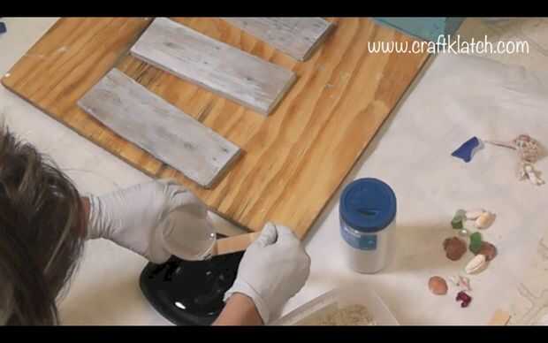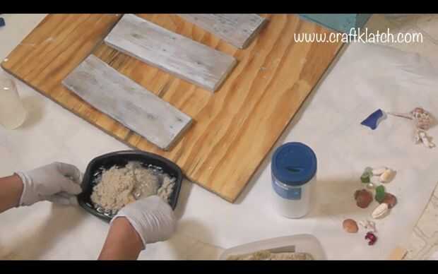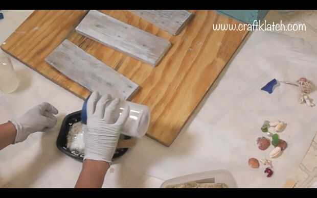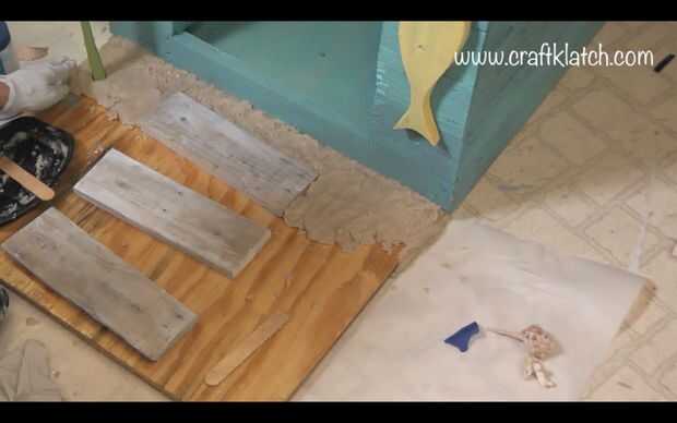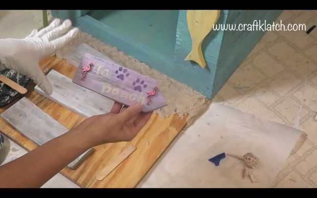 Para el patio delantero, mezclé resina, juego de fina arena (Home Depot) y brillo blanco grueso. La resina mezclada con la arena oscurecerá por la arena. La adición de blanco brillo, aclarará lo para arriba otra vez. No tengo proporciones específicas. Suficiente de la arena y el brillo mezclado con la resina para hacer grueso. Me aseguré que estaba todo cubierto y bien mezclado, pero tenía que ser capaz de mantener la forma, o bien la arena se hundiría y habría una capa de resina en la parte superior. Pongo papel de pergamino en los bordes de la base, por lo que cualquier mezcla de arena de la resina no atranca a mi piso. Luego empecé a aplicar a la base - recuerde los bordes. Pongo un montón alrededor del árbol de Palma, entre el paseo de madera. Luego añadí las conchas de mar y playa cristal. También había hecho una muestra de madera, con un punto, estarcidos Para la playa y algunas patas y pegado dos botones flamingos. Encaja en la arena también. Tenía una llave vieja, que encajado detrás del letrero (todo el mundo esconde una llave en algún lugar, a la derecha?).