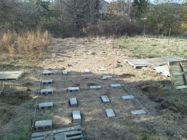 El primer paso que tomamos en el proceso este galpón iniciado era preparar un área en el suelo para empezar a construir nuestro piso. El punto que decidí poner este era justo al lado de donde ponemos nuestro jardín anual, desafortunadamente la tierra no estaba completamente nivel así que tuvimos que comenzar por nuestra zona con algunos bloques de hormigón de nivelación. El piso fue construido encima de estos bloques para mantener el suelo con la esperanza de impedir que la madera de la descomposición.