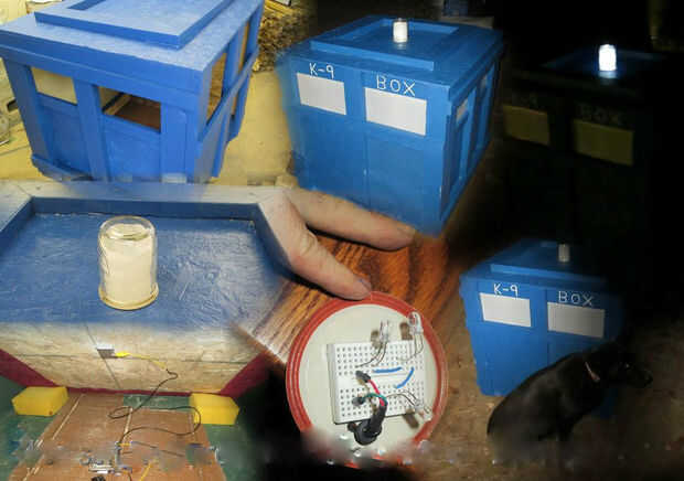 Todo comenzó con mi Instructables de Halloween. Uno de mis apoyos era bufanda el cuarto Doctor. Desde entonces, yo he sido volver a ver la serie con mi hija. De alguna manera la idea vino a mí, en parte sólo de leer los diferentes concursos y pensando en lo que sería cool. ¿Qué pasa si re-purposed la máquina del tiempo en una caseta de perro que enciende para arriba cuando el perro estaba dentro? Especialmente si usted tiene un perro al aire libre o al ganado, bueno para saber cuando están "en la noche". El principio básico era diseñar a algún tipo de sistema de sensores, y era mi idea favorita para que la plataforma de piso completar el circuito cuando empuja hacia abajo. Yo quería que fuese móvil, usé una instalación de la batería. Un diseño de plug-in también haría muy bien. Un montón de opciones existe para ambas configuraciones. Planeo construir una versión de Faro a continuación.