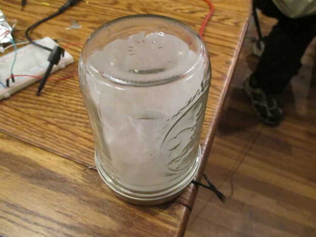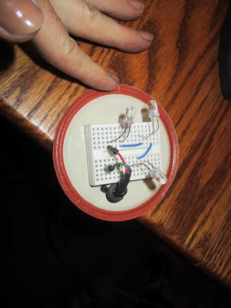 2. configurar en protoboard pequeña, taladro a través de tapadera a alimente el alambre con pegamento caliente