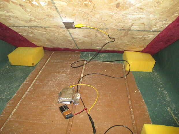 5. configuración batería: pegamento rectangular unidad de vivienda (yo usé la mitad de un shell remoto) al centro inferior se deslice 9V en. Pila de aproximadamente 1/2" espesor de papel de aluminio encima de este techo