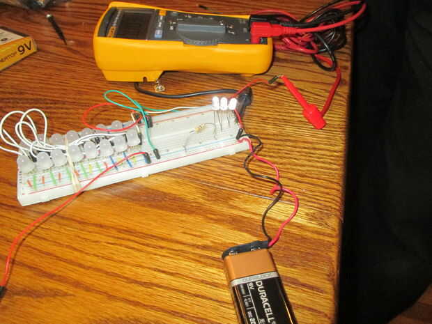 3 LED, resistencia de ohm 465, batería de 9V con conector snap