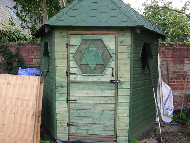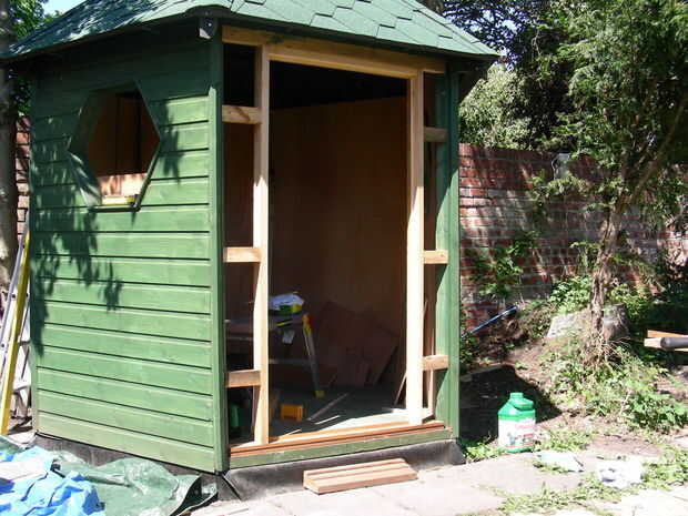 La puerta era construcción de marco y de la piel y he utilizado unos recortes para reflejar el patrón de la ventana. He añadido a esto más tarde ya que era un poco demasiado como una estrella de David, aunque terminaron las ventanas un poco masónica.